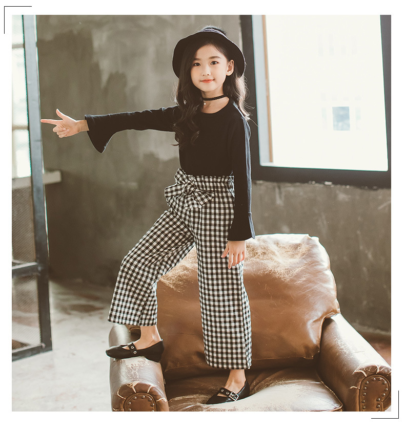 2020 Teenage Girls Korean Fashion Suit Black Tops Plaids Loose Pants 2pcs Sets Ebay